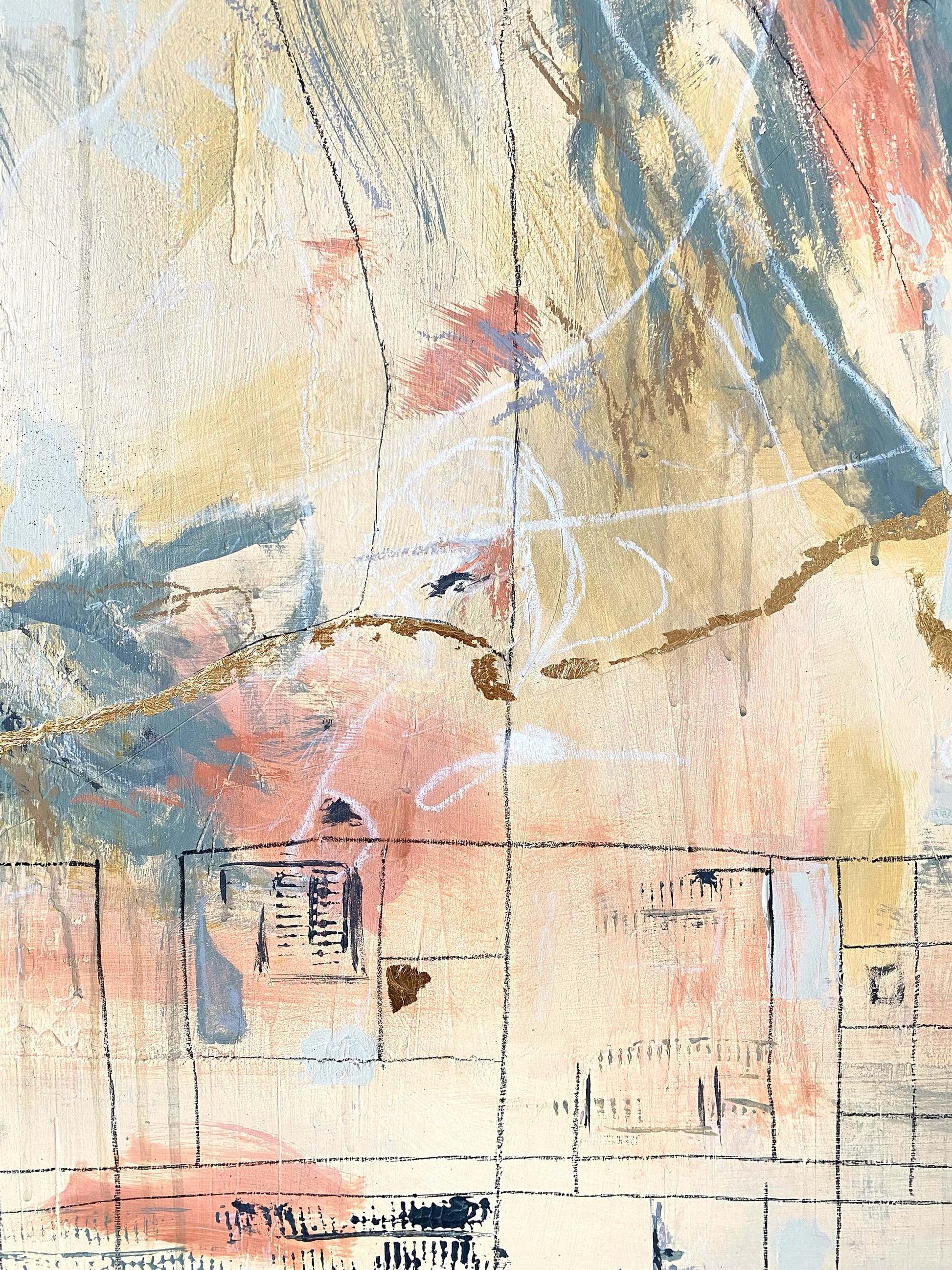24"x36" Mixed Media Textured Abstract Painting. Acrylic, Charcoal, Gold Leaf. Ships as a stretched canvas, signed on back with artist signature, name of piece and date. Comes with Certificate of Authenticity. Please note actual colors in this painting may vary from screen to screen.