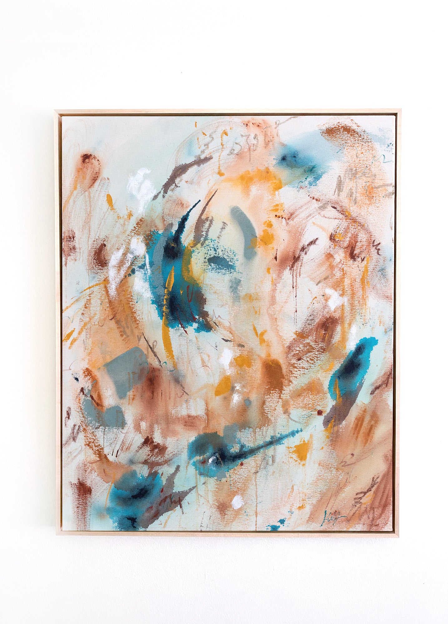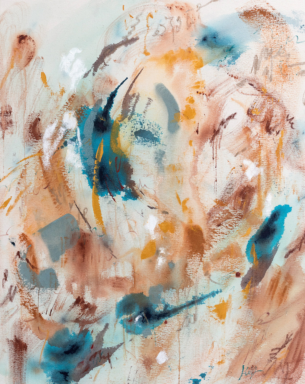 24"x30" Mixed Media painting on canvas with acrylic, charcoal and copper leaf. Ships as a stretched canvas with pine frame, signed on back with artist signature, name of piece and date. Comes with Certificate of Authenticity. Please note actual colors in this painting may vary from screen to screen.